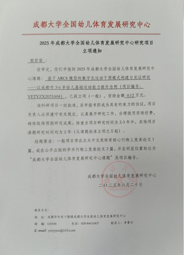 近日,全国幼儿体育发展研究中心公布2025年度项目立项的通知,我校有1个项目获此立项。具体情况如下: