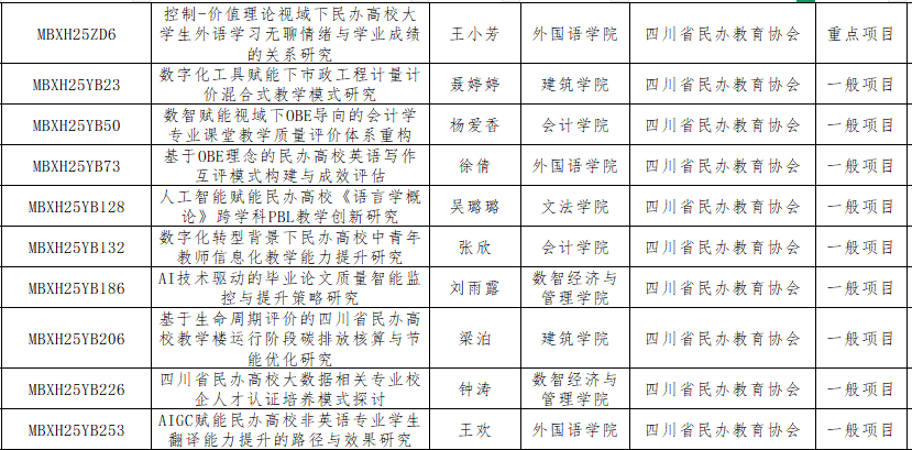 近日,四川省民办教育协会公布2025年研究课题立项的通知,我校有10个项目获此立项。具体情况如下: