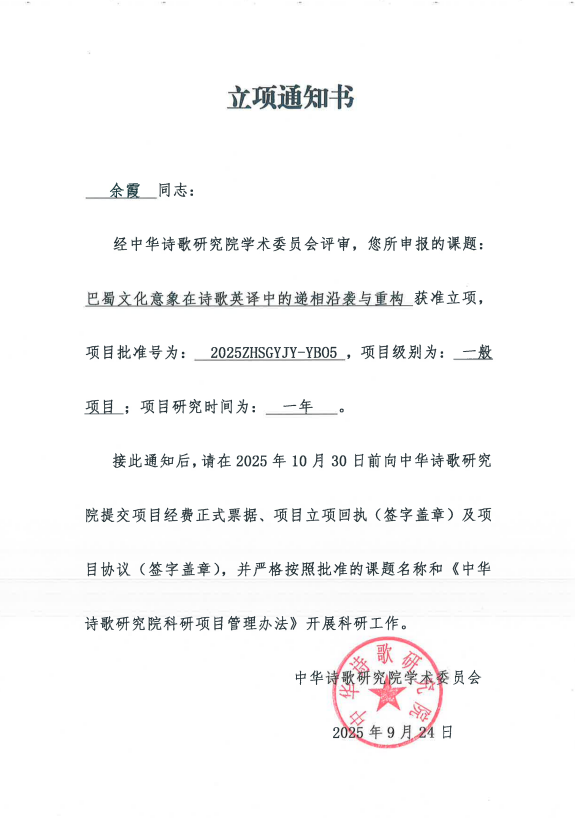 近日,中华诗歌研究院公布2025年度项目立项的通知,我校有1个项目获此立项。具体情况如下: