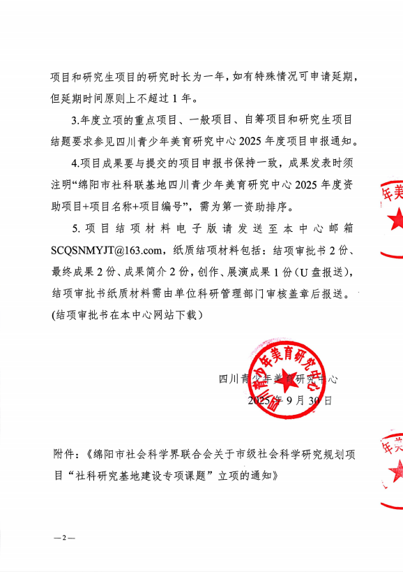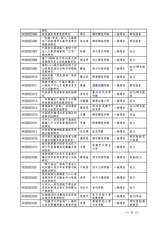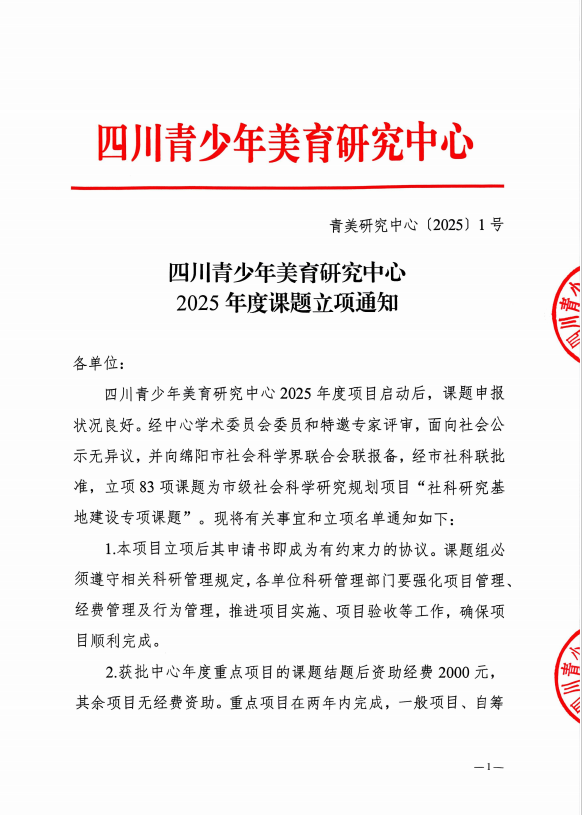 近日,四川青少年美育研究中心公布2025年度课题立项的通知,我校有1个项目获此立项。具体情况如下: