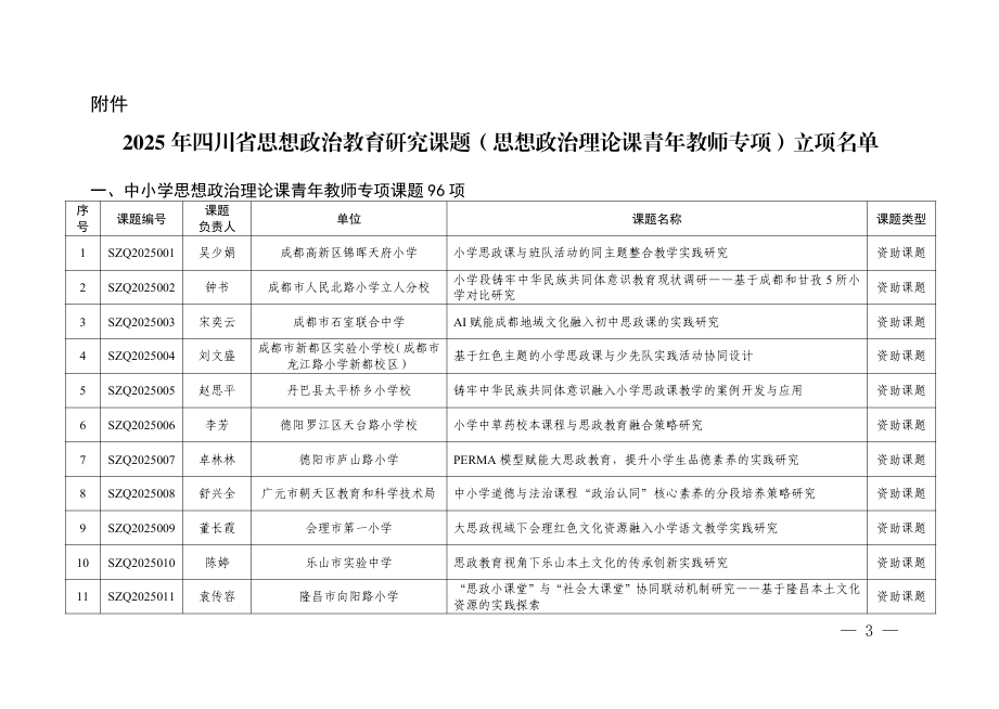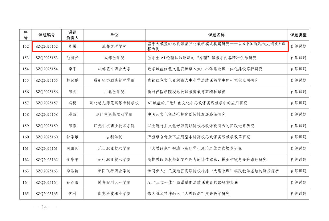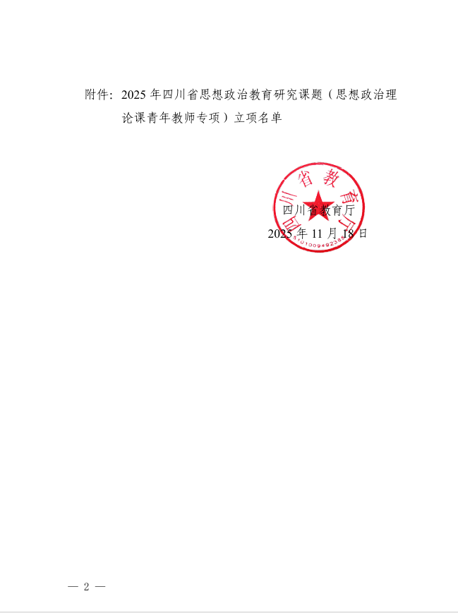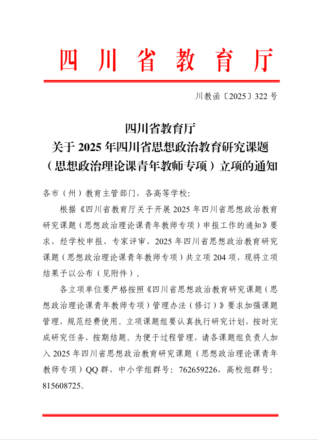 近日,四川省教育厅公布2025年四川省思想政治教育研究课题(思想政治理论课青年教师专项)立项通知,我校有1个项目获此立项。具体情况如下: