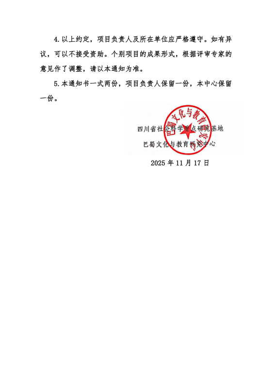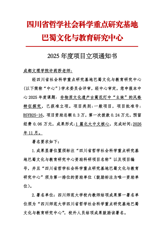 近日,巴蜀文化与教育研究中心公布2025年度项目立项通知,我校有1个项目获此立项。具体情况如下: