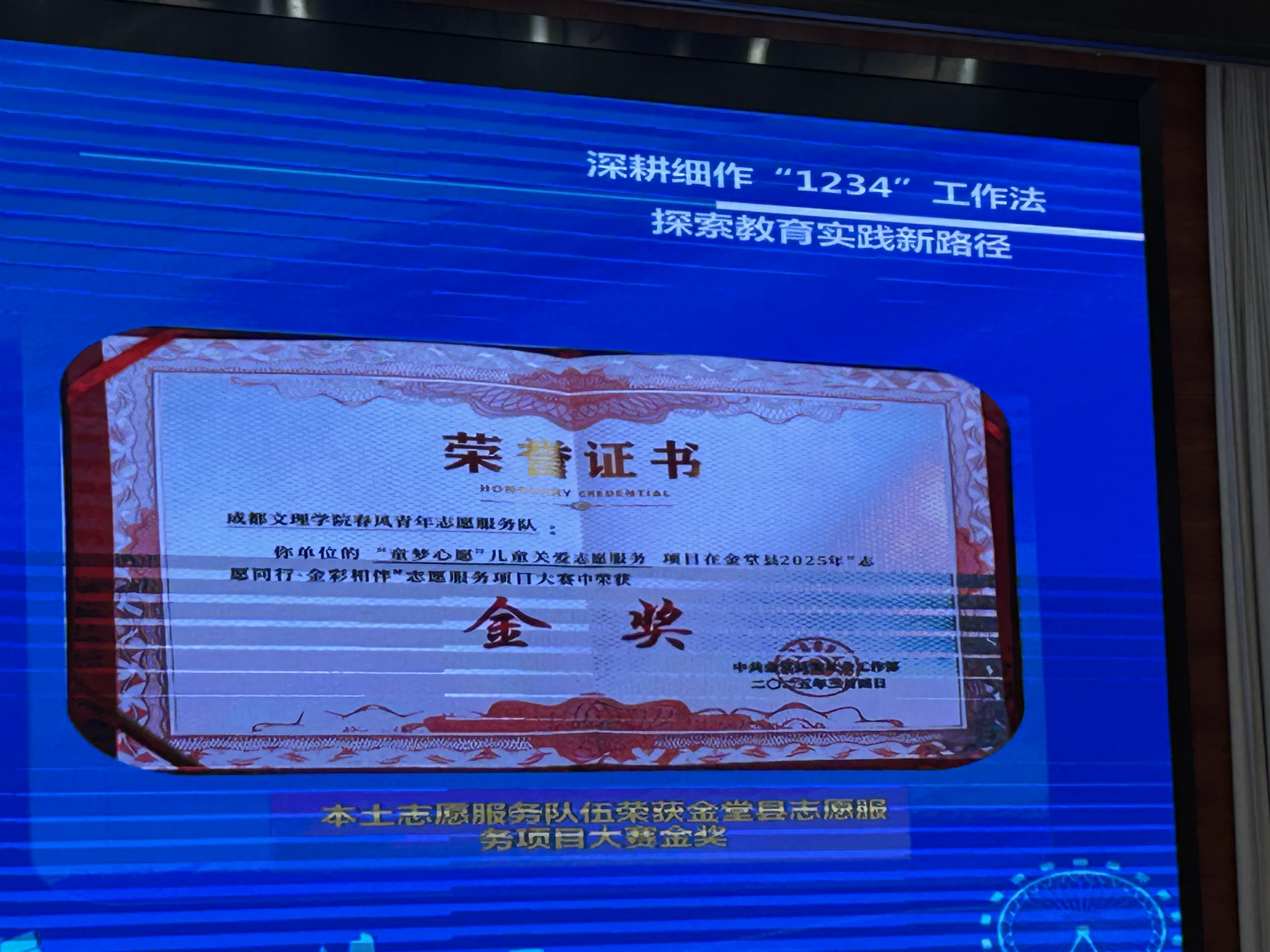 成都文理学院春风青年志愿服务队的“童梦心愿”儿童关爱志愿服务项目在金堂县2025年“志愿同行·金彩相伴”志愿服务项目大赛中荣获金奖。